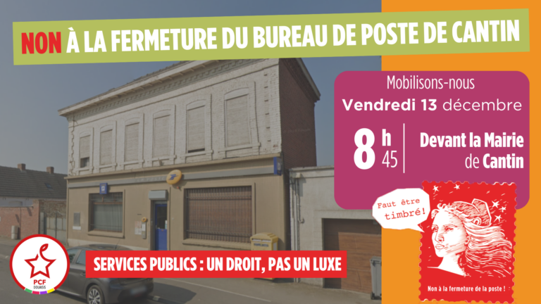 Avec les habitants de Cantin : Non à la fermeture du bureau de poste ! Les communistes du Douaisis apportent leur soutien plein et entier aux habitants de Cantin et à leur municipalité, mobilisés contre la fermeture annoncée du bureau…